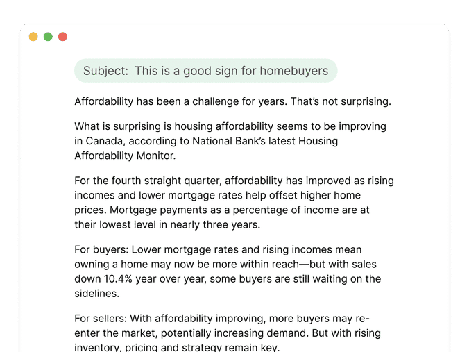 When you consistently share market insights, you position yourself as the go-to expert—someone clients trust long before they’re ready to buy or sell. That’s why we’ve crafted this value-first email for you. It delivers key market trends in a way that’s easy to digest and keeps you top-of-mind.