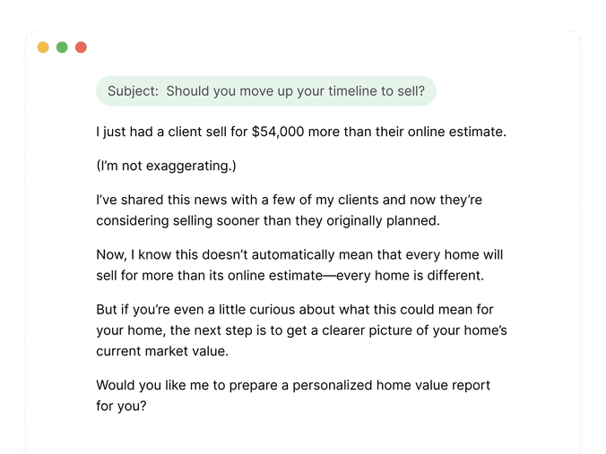 Your clients look to you for real market insights—not headlines, not hearsay. Whenever you have a marketable moment—a real success story like a client selling above their Zestimate or getting multiple offers—it’s a prime opportunity to send an email like this.