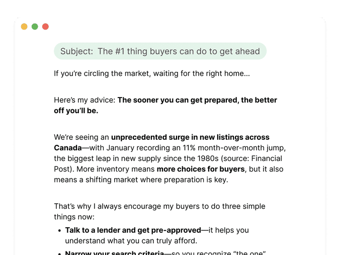 When you consistently share market insights, you position yourself as the go-to expert—someone clients trust long before they’re ready to buy or sell. That’s why we’ve crafted this value-first email for you. It delivers key market trends in a way that’s easy to digest and keeps you top-of-mind.