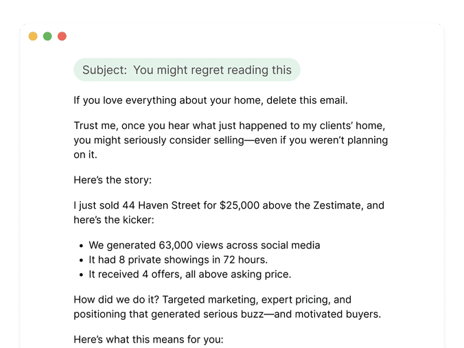 This email is so effective because it challenges that assumption with real results. If you recently worked with a client who had an outdated home, needed big-ticket repairs, and believed a traditional sale wasn’t worth the hassle, this is your chance to shift their perspective. Instead of pouring money into renovations or taking a lowball offer from an iBuyer, they leaned on your network of buyers. The result? A sale that netted them significantly more than an instant offer.