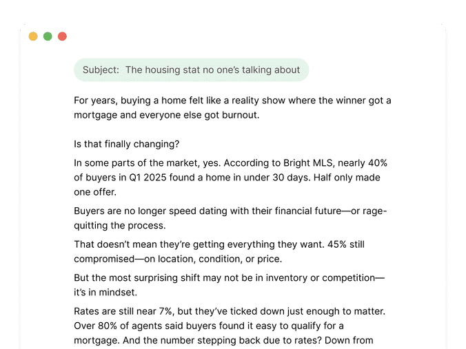 Because slower doesn’t mean stalled—and soft doesn’t mean broken. This email gives your audience a clearer lens: one that helps them see today’s market as something to better understand.