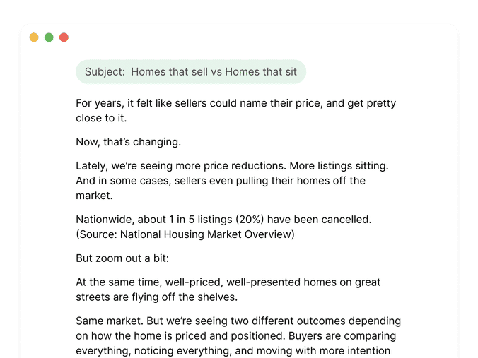 This email helps you name that disconnect and start the kind of conversation that leads to smarter pricing, stronger positioning, and fewer surprises. We also added a soft P.S. for buyers—because in this market, some well-priced homes are absolute steals.