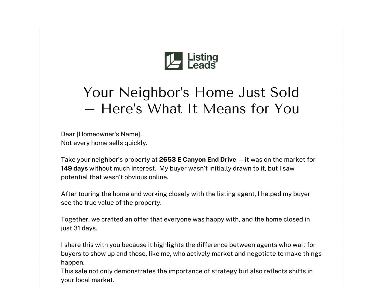Because it doesn’t just announce a listing,it answers the one question every homeowner actually cares about: “Why should I care?”