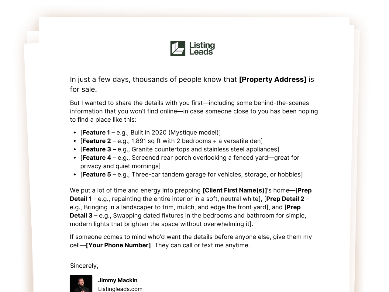 This isn’t about announcing a listing, it’s about creating demand before it hits the market.Send it, and you’re not just marketing a home. You’re making it feel like an opportunity buyers can’t afford to miss.