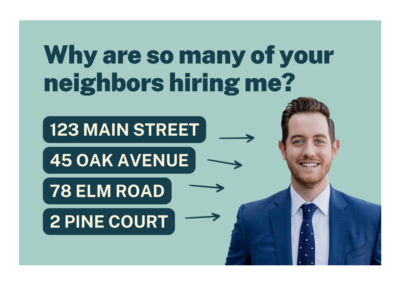 It opens with a confident question—Why are so many of your neighbors hiring me?—then delivers proof: multiple nearby sales, strong results, and a compelling offer that flips the usual listing pitch.