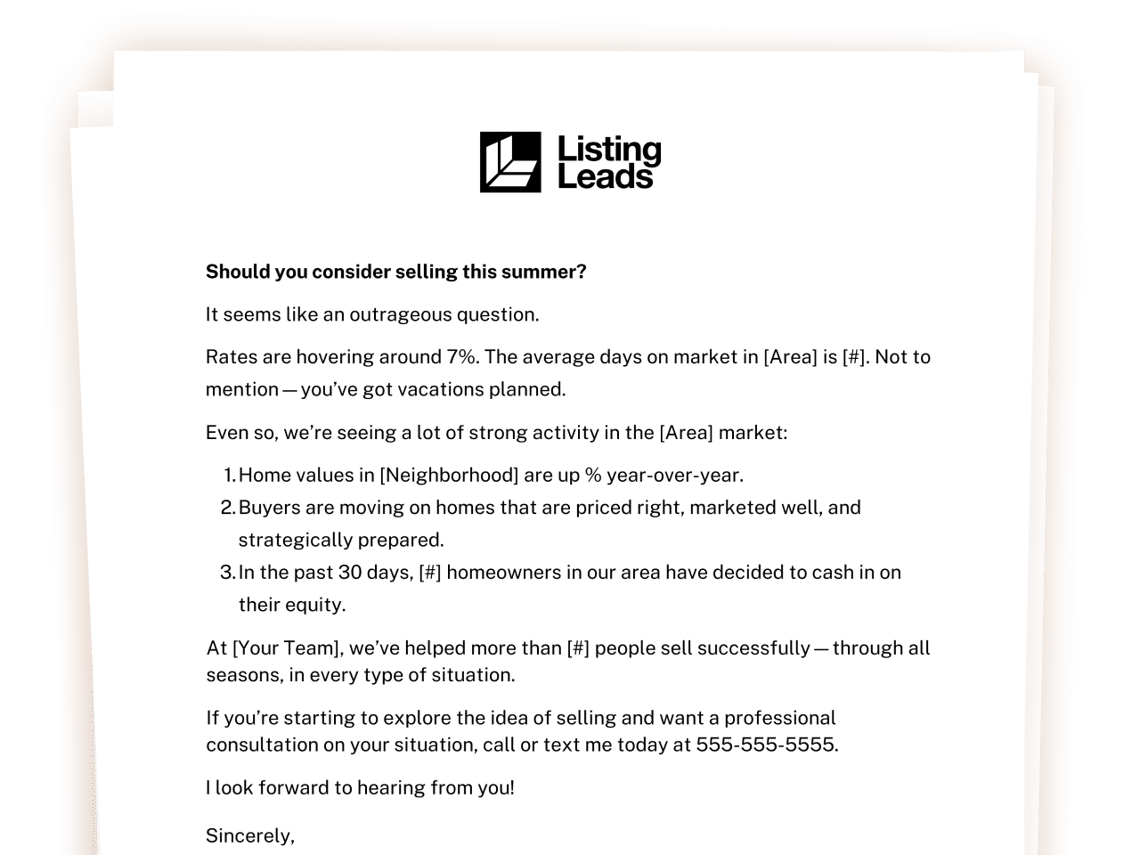 That’s not just a headline—it’s a conversation starter. And this letter is designed to turn that market reality into a moment of connection with sellers who’ve pulled their homes off the market.