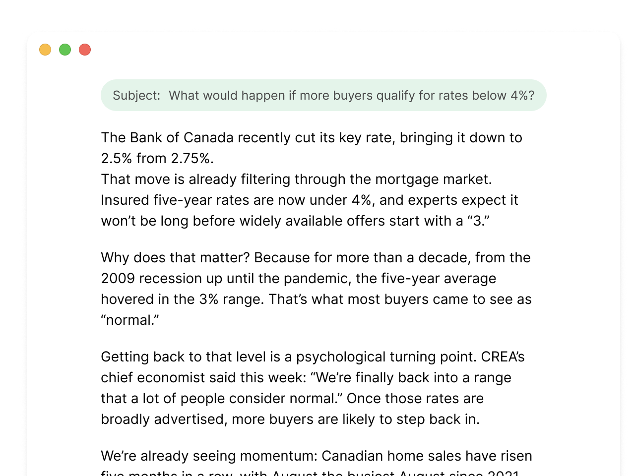 That’s the story we’re telling with this campaign. CREA’s chief economist is already pointing to a shift: sales are climbing, five months in a row, and buyers see sub-4% as a return to “normal.”